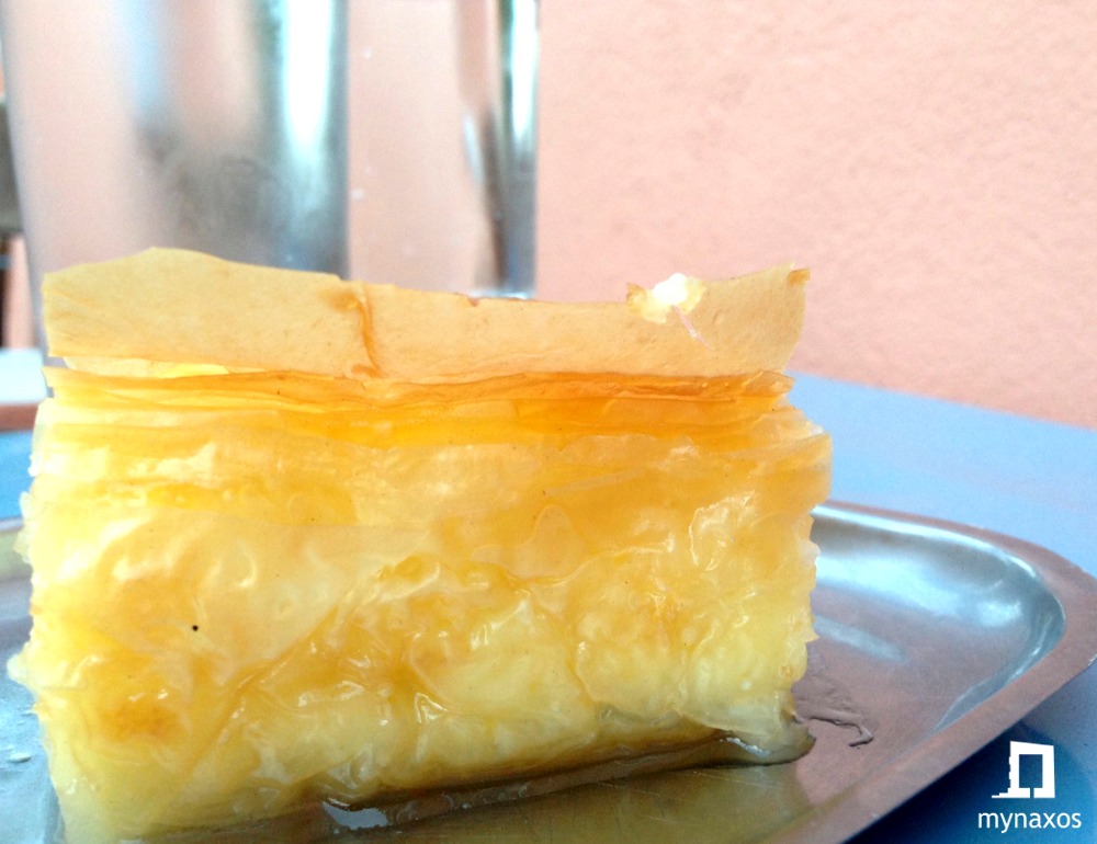 Στο μικρό παραδοσιακό καφενείο στην αρχή του χωριού, μπορείτε να φάτε το πιο διάσημο γαλακτομπούρεκο του νησιού με μια μυστική συνταγή που μεταφέρεται από παππού σε εγγονό.